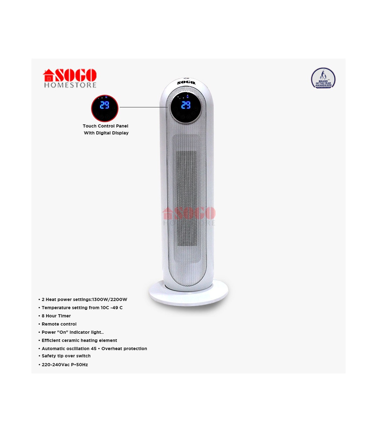 • 2 Heat power settings:1300W/2200W